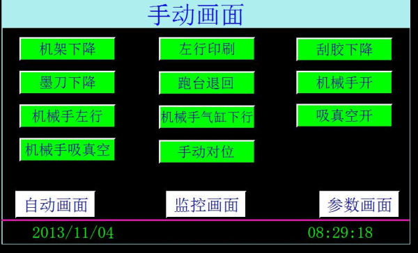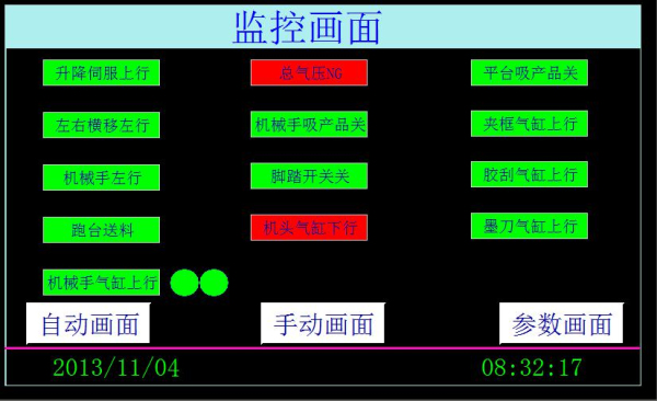 1、自动画面:设备运行时的主画面,控制设备的启停、报警显示及一些继电器的开关。
