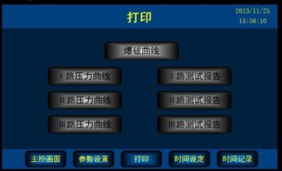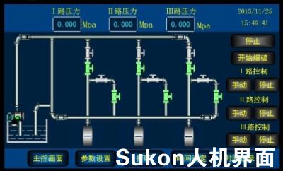 主要由Sukon触摸屏HC-Suk070构成。该系统分为主控画面,参数设置,打印,时间设定和时间记录。主控画面用来监视相关管道的状态和手动等操作,参数设置可以设置压力等参数,时间设定和时间记录可以设置和记录相应实验的时间。