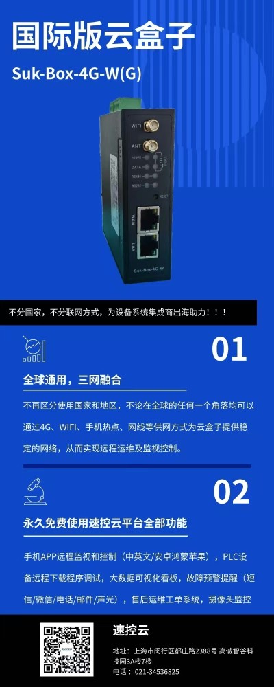 速控物联网云盒子国际版SuK-BoX-4G-W(G),全球通用,可以在全球任意国家使用,同时支持无线wifi,手机热点,4G流量卡,有线等方式联网。支持对主流PLC远程控制,例如西门子,三菱,欧姆龙,台达,信捷,汇川等。可以对设备远程监控,大数据管理和分析,微信小程序画面监控报警信息推送,PLC程序远程下载调试,摄像头远程监控管理,售后维保系统等功能,大大的降低了工程人员的出差时间和费用,有效提供工作效率。