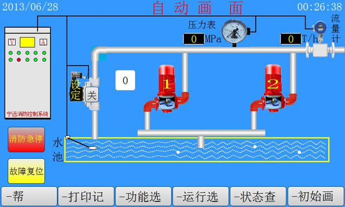 3.4、进入系统状态画面,可以查询各设备状态,包括电机正在变频运行还是工频运行。水箱液位情况、变频运行情况等,若发生故障,操作人员应到现场解决故障,待故障消除后按下“复位”按钮,系统恢复初始状态。